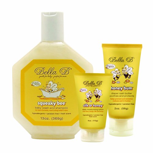 - Includes squeaky bee body wash and shampoo; silk and honey baby lotion, and honey bum diaper rash
